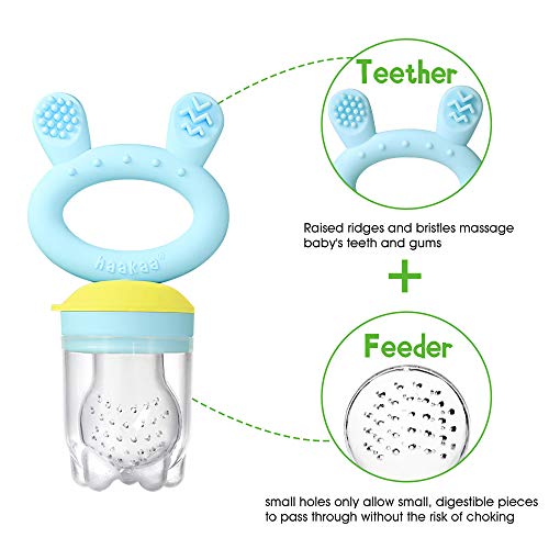 - Unique Design Baby Products by Haakaa:All in one design with feeder and teether.Raised ridges and bristles on the rabbitt's ears massage your child's teeth and gums.New feet on the cap to allow you to stand feeding teether up and dust prevention