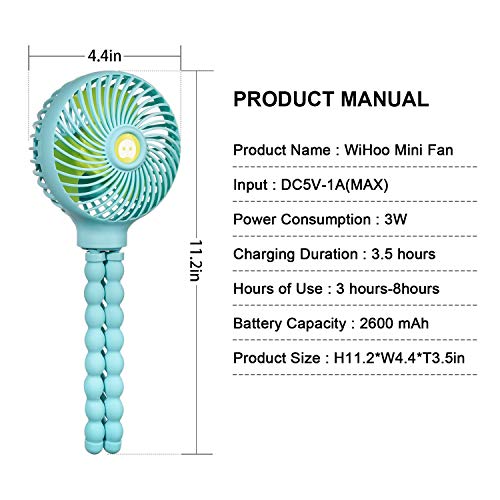 Details: WiHoo portable baby fan with flexible tripod to keep you and your baby cool and entertained. Why choice us: - Creative flexible tripod design, free your hands! - Folding and small shape, put it inside in your backpack easily, it would be a good partner for you, when going outdoors like travelling, riding bike, hiking, climbing, camping, exercising etc. - Safe and durable, plastic caged cover and high quality ABS material keep your infant safe. - Adjustable 3 speeds: Low - Medium - High. Choose the appropriate fan speed as you wish, fits for all ages. NOTE: 1.Please charge the stroller fan before use. 2.Please turn off the battery fan and take out the 18650 battery if you do not use for a long time. 3.It is not recommended to put it within reach of baby's hands in case that baby put his hands into the fan. 4.Do not place this product in high humidity and high temperature. 5.Please do not knock, break and dismantle the product. SPECIFICATIONS: Material: ABS and Silicone Fan diameter: 4.4in/11.2cm Height: 11.2in/28.4cm Weight: 0.5lb Output power: 3W Input current: DC5V-1A(MAX) Charging time: 3.5 hours Charger: input: 5V output: 5V-9V Battery: Li-ion 18650-3.6V 2600mAh Battery install method: rechargeable Speed mode: 3 speeds mode PACKAGE LIST: 1 x Portable Baby Fan 1 x Rechargeable Battery(18650-3.6V 2600mAh) 1 x Charging Cable 1 x User Manual