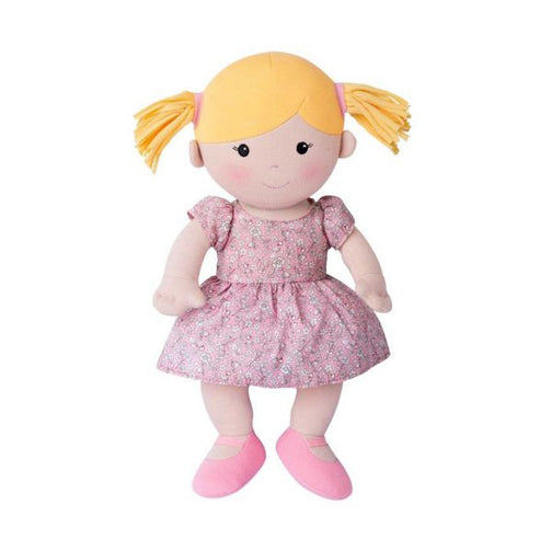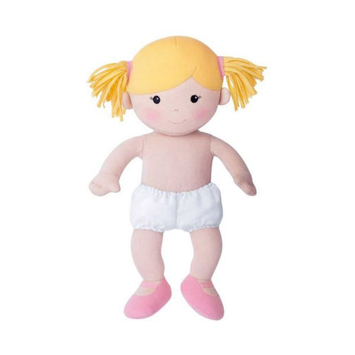 - Features a fair skin tone, tactile knit jersey pigtails, embroidered eyes, nose and mouth, delicately blushed cheeks, a removable dress, removable underwear and attached Mary Jane shoes.