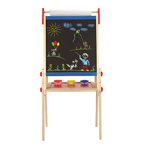 Details: Product Description This all-inclusive easel really has it all! The best-selling All-in-One Easel from Hape features a magnetic whiteboard on one side, and an easily erasable chalkboard on the other, as well as a convenient refillable paper roll. The height is fully adjustable to three different levels, encouraging artists young and old. Special screw down clamps keep your paintings and drawing nice and flat for the best artistic experience. Includes color coded sealable pots for paint, and a large tray to hold all your artistic utensils. Some easy assembly required for this compact and easily storable easel. Made from wood sourced from environmentally sustainably sourced forests. Durable child-safe paint finish and solid wood construction make this a toy your child will love for years to come. Hape toys stimulate children through every stage of development and help nurture and develop their natural abilities. All Hape products sold in North America meet or exceed all applicable safety standards. The All in One Art Easel is the proud recipient of the Oppenheim Toy Portfolio Gold Seal Award for 2014. Do not wash Brand Story By Hape