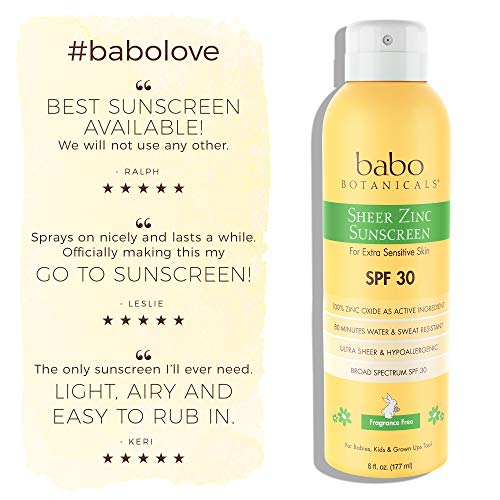 Details: Babo Botanicals Sheer Zinc Sunscreen is a natural SPF 30 spray specifically developed for extra sensitive skin. Our protective, fragrance-free formula is designed to guard delicate skin against damaging UVA and UVB rays, with up to 80 minutes of water and sweat resistance. This continuous spray sunscreen is ultra-sheer, non-greasy and lightweight enough for daily use. Our mineral sunblock is Zinc-based to protect your entire family from the sun's damaging rays. Plant-based ingredients include aloe vera, sunflower seed oil and jojoba to nourish and hydrate the skin. This sunscreen spray is gentle enough for babies, but effective enough for all ages. It applies easily; just shake well, press the button and you’re good to go. Reef-safe with no oxybenzone or octinoxate. Enriched with Babo's exclusive, organic Nutri-Soothe Complex. Meets EWG VERIFIED criteria, making it safe for everyday use. Made in the USA and B Corp Certified.