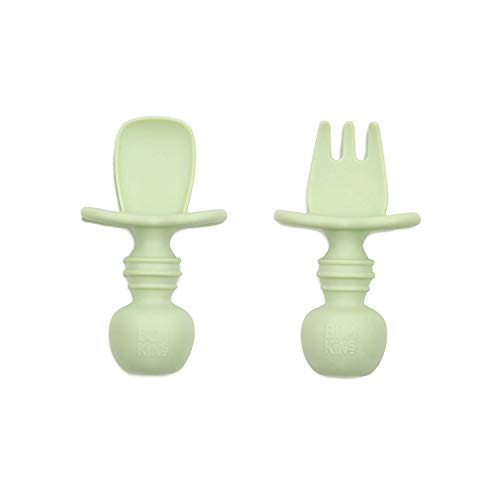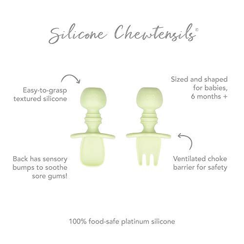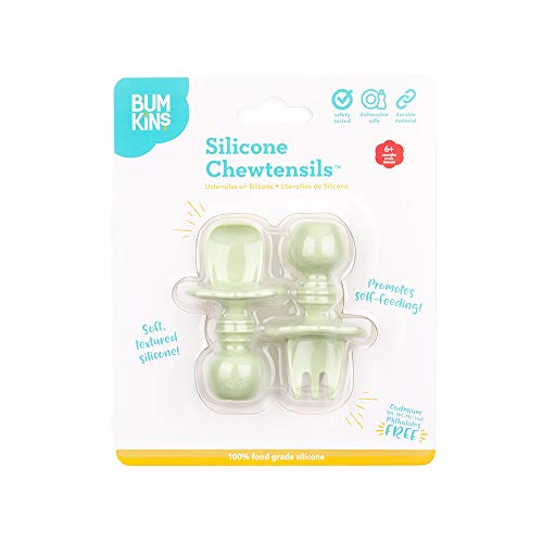 Details: Bumkins Chewtensils™ are intended for Stage 1 of baby led weaning – introducing babies to the concept of holding a utensil and feeding themselves. We made Chewtensils from soft, textured, food-grade silicone that easy to grip and is gentle on tender gums, with bendable heads for safety. They are perfect for dipping into puréed foods at the early part of baby led weaning. Chewtensils are intended for babies before they have a firm grasp on self-feeding (best for dipping and scooping, not yet spearing solid foods.) The back of the spoon head has sensory bumps to stimulate gums. Safe to use – made from 100% food-grade silicone and BPA-free, BPS-free, PVC-free, phthalate-free, cadmium-free and lead-free. CPSIA compliant. Dishwasher-safe (top rack). For ages 6 months and up. Each measure approximately 3” long, 1.75” wide. Do not leave child unattended with product. Discard if damaged or torn. Designed in Arizona, responsibly made in China.
