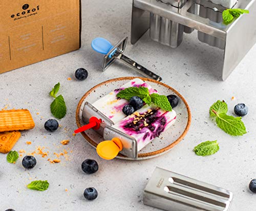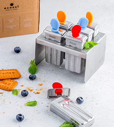 Ecozoi Stainless Steel Ice Popsicle Molds And Rack - 6 Mini Ice Pop Makers + 6 Reusable Stainless Steel Sticks + 12 Silicone Seals + 1 Rack | Reusable, Sustainable, Eco Friendly