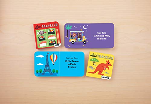 Details: Introduce your little traveler to landmarks, food, animals, and vehicles from around the world with Mudpuppy's Little Traveler Board Book Set. The Board Book Set includes 4 mini board books, 8 pages per book, packaged together in a slipcase box. The 4 board books feature Food, Vehicles, Landmarks, and Animals from countries around the world: - Food: Germany, Mexico, Japan, Italy - Vehicles: England, United States of America, Barbados, Thailand - Landmarks: France, Egypt, India, United States of America - Animals: Madagascar, Iceland, Galápagos, Australia • Package in a slipcase: 4" cube • 8 pages per book, 32 pages total • Greyboard contains 90% recycled paper. Printed with nontoxic inks. • Ages 0-5