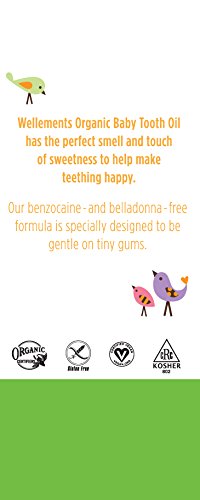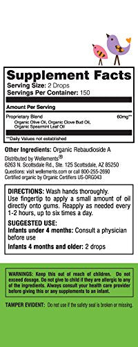 Details: Wellements Organic Baby Tooth Oil has the perfect smell and touch of sweetness to help make teething babies happy. Our benzocaine-free and belladonna-free formula is specially designed to be gentle on tiny gums and is certified USDA organic. Wash your hands thoroughly before using fingertip to apply a small amount of Organic Baby Tooth Oil directly onto gums. Reapply as needed every 1-2 hours, up to six times a day. Suggested Use: Infants 0-4 months: Consult a physician before administering. Infants & toddlers 4 months & older: 2 drops. Wellement's promise is to provide products that are safe, natural and effective. All of our products are made with simple, natural and organic ingredients, leaving out all of the unnecessary preservatives, chemicals and additives. We are proud to say our product requires no refrigeration after opening and it is free from preservatives — just the way nature designed and the way it should be for your little one! We know that a healthy foundation makes for a healthy life, and that's why we believe in wellness from the beginning.